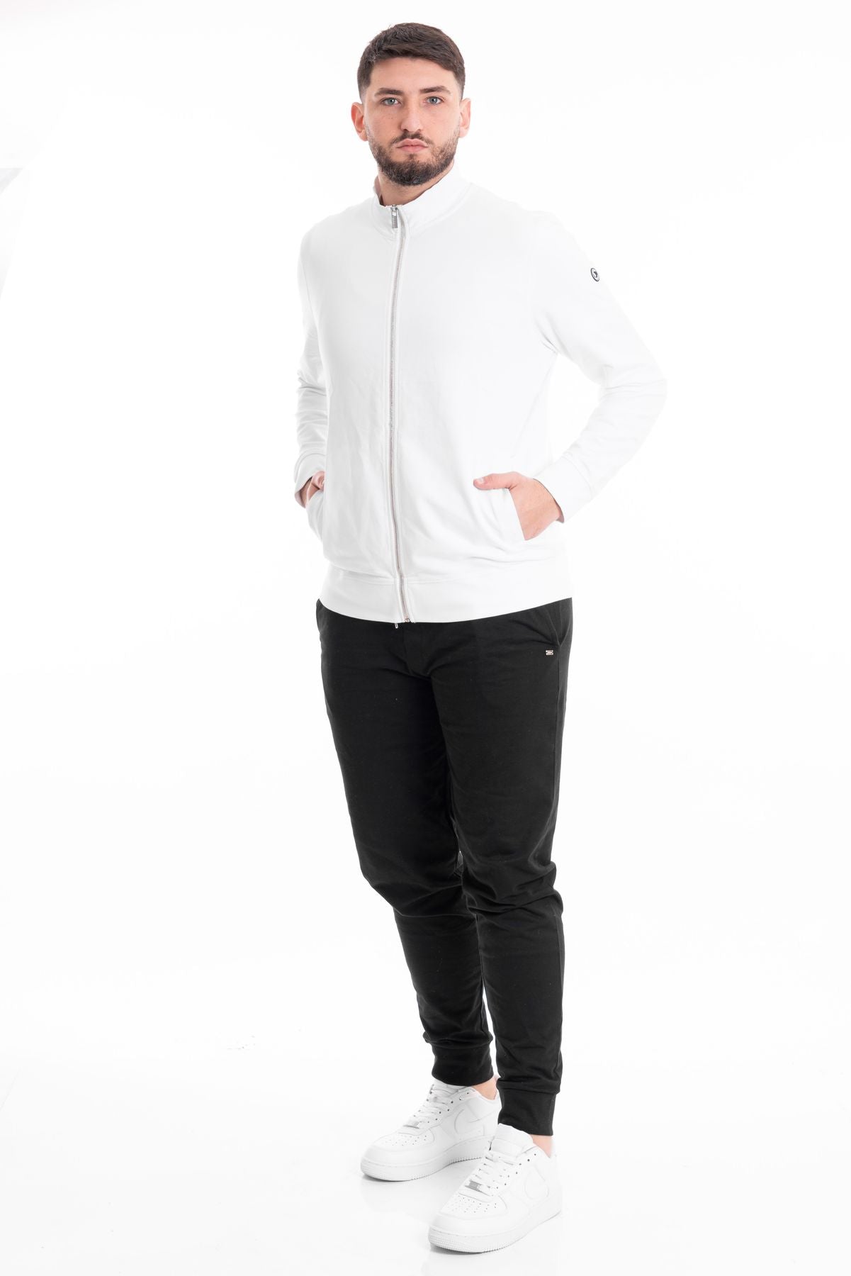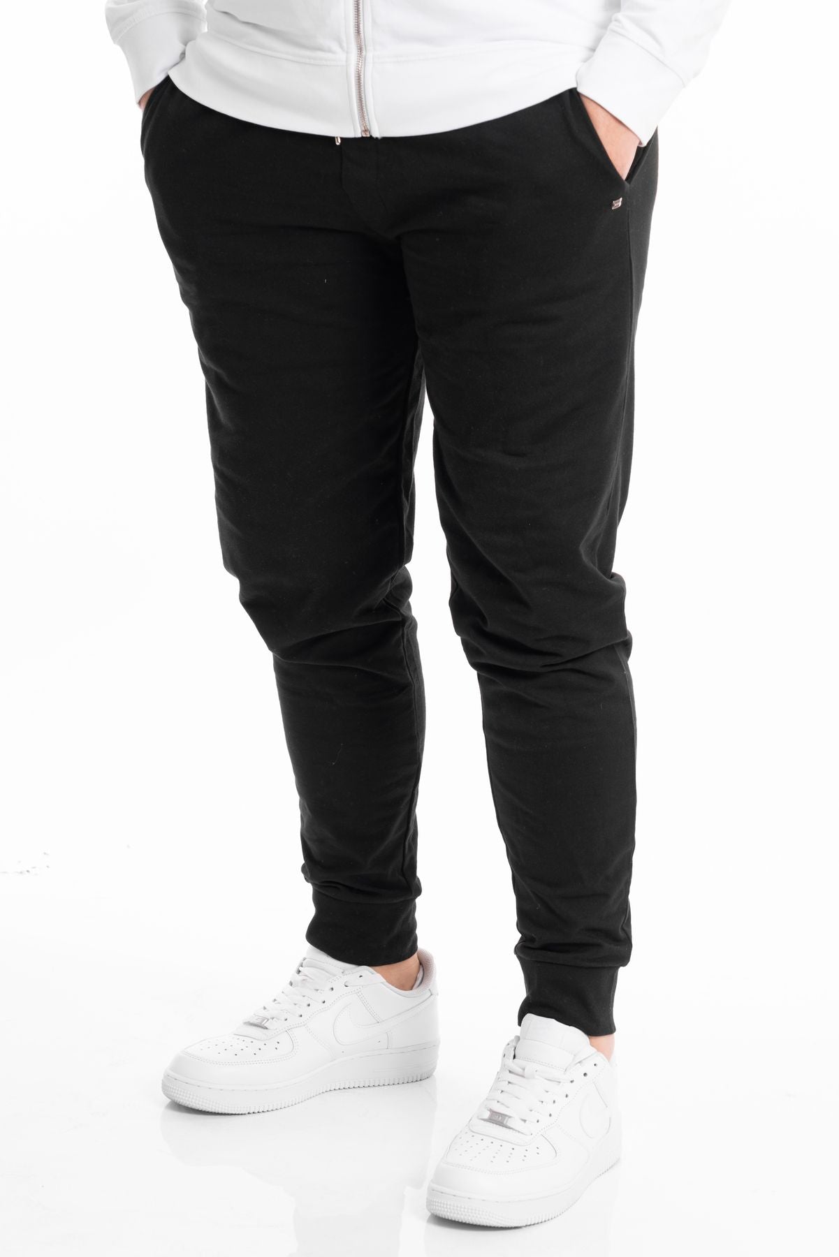 Pantalone sportivo modello tuta in tessuto cotone garzato. Vita con elastico e coulisse per modulare la vestibilità, tasche laterali. Gamba dritta e fondo stretto con elastico. Vestibilità regolare. Composizione tessuto 100% cotone.