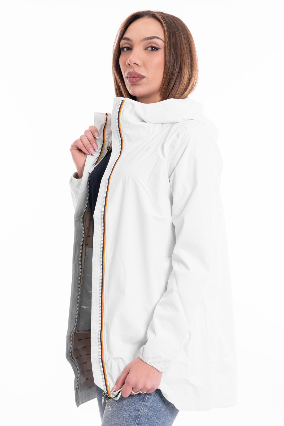 Il cappuccio regolabile e le tasche con zip la rendono pratica e versatile. Il logo K-Way stampato all over in tonalità argento aggiunge un tocco di lusso.