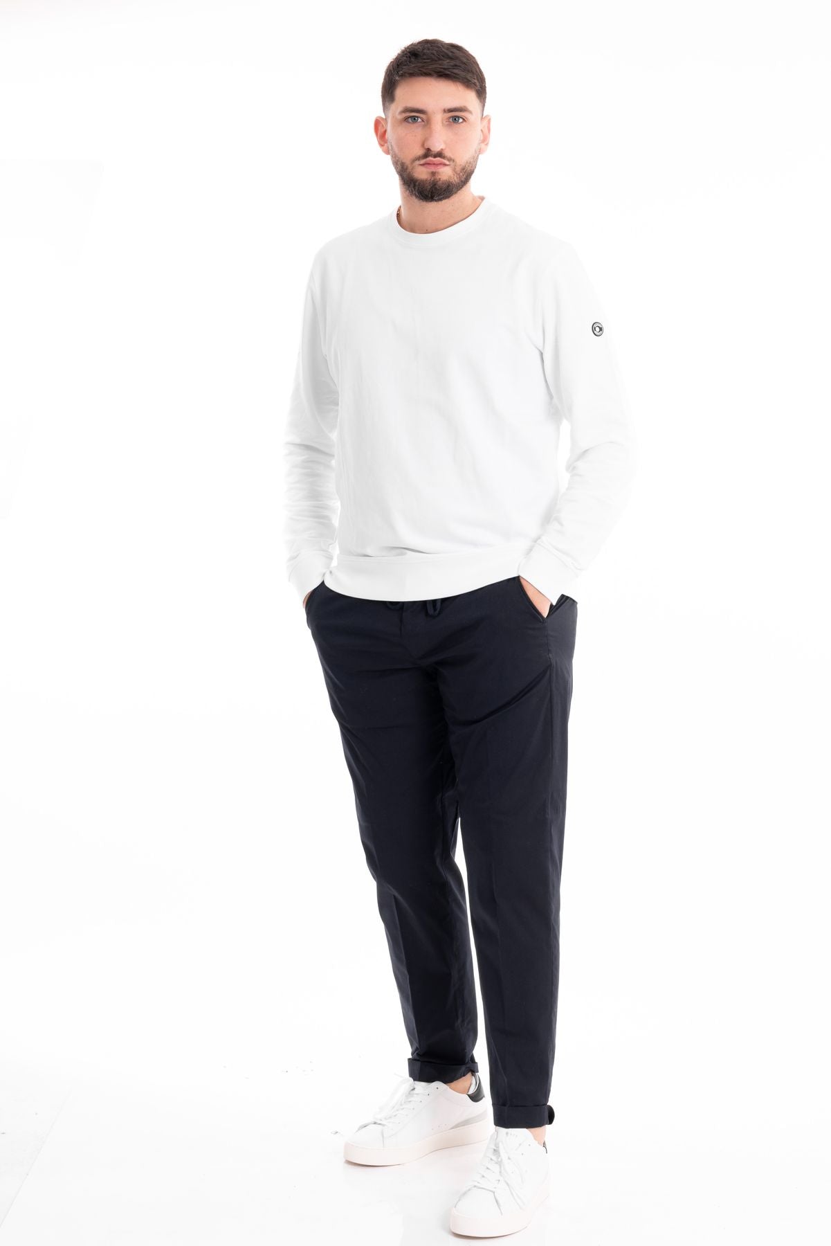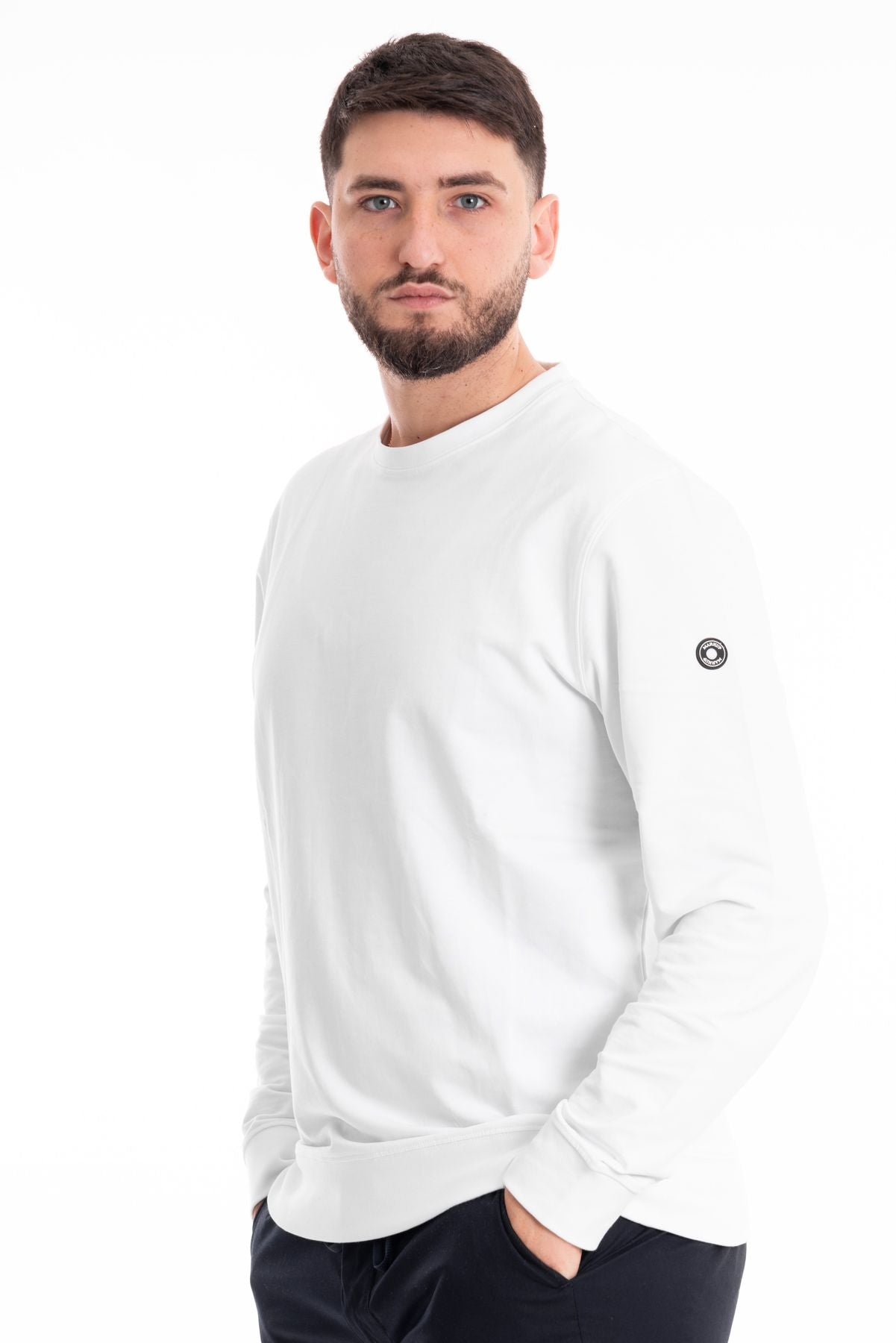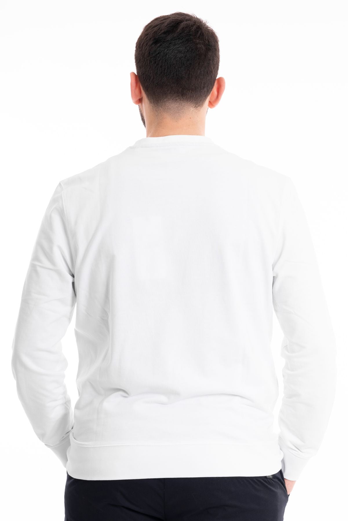 Felpa basica in tessuto cotone garzato. Girocollo con bordo liscio. Maniche lunghe, polsini e fondo elasticizzati. Vestibilità regolare. Compsoizione tessuto 100% cotone.