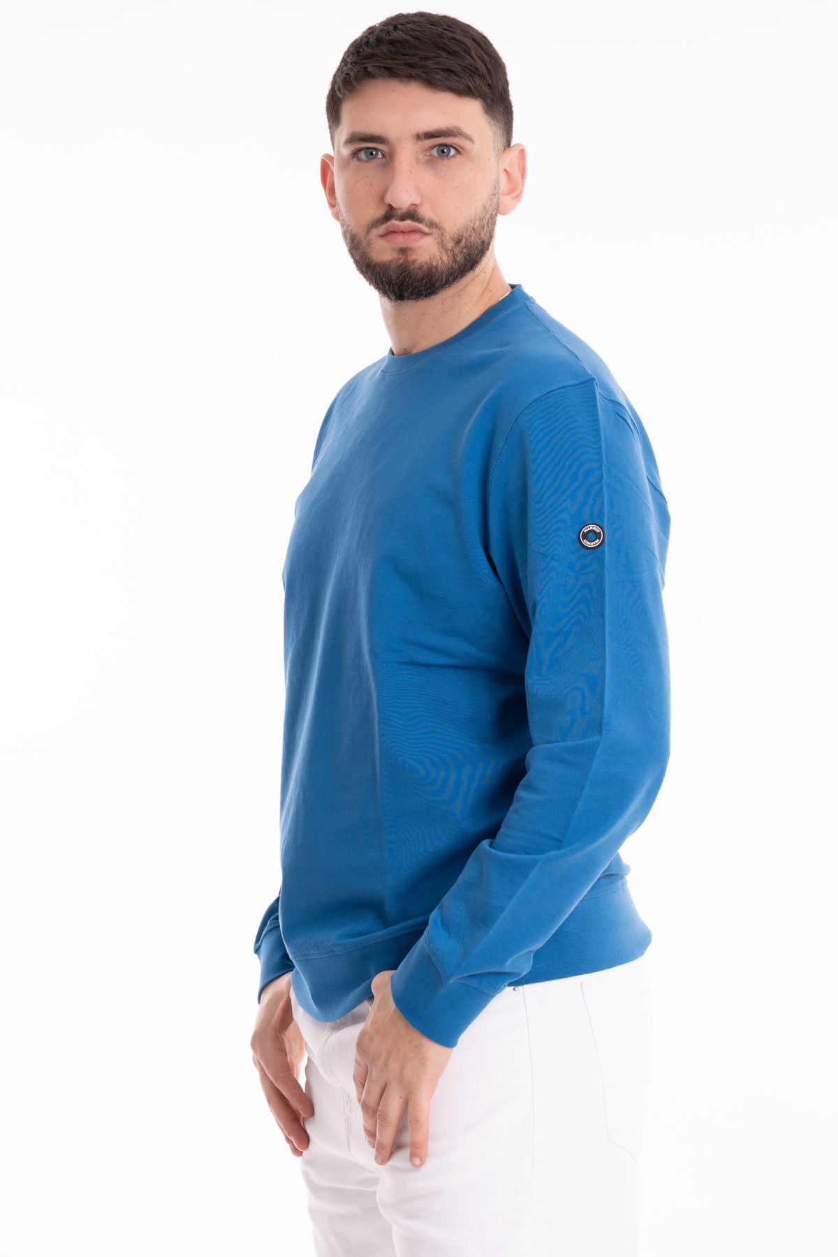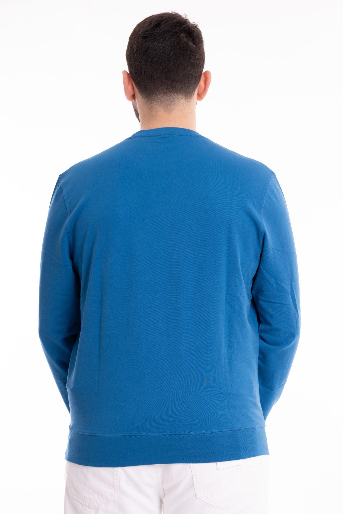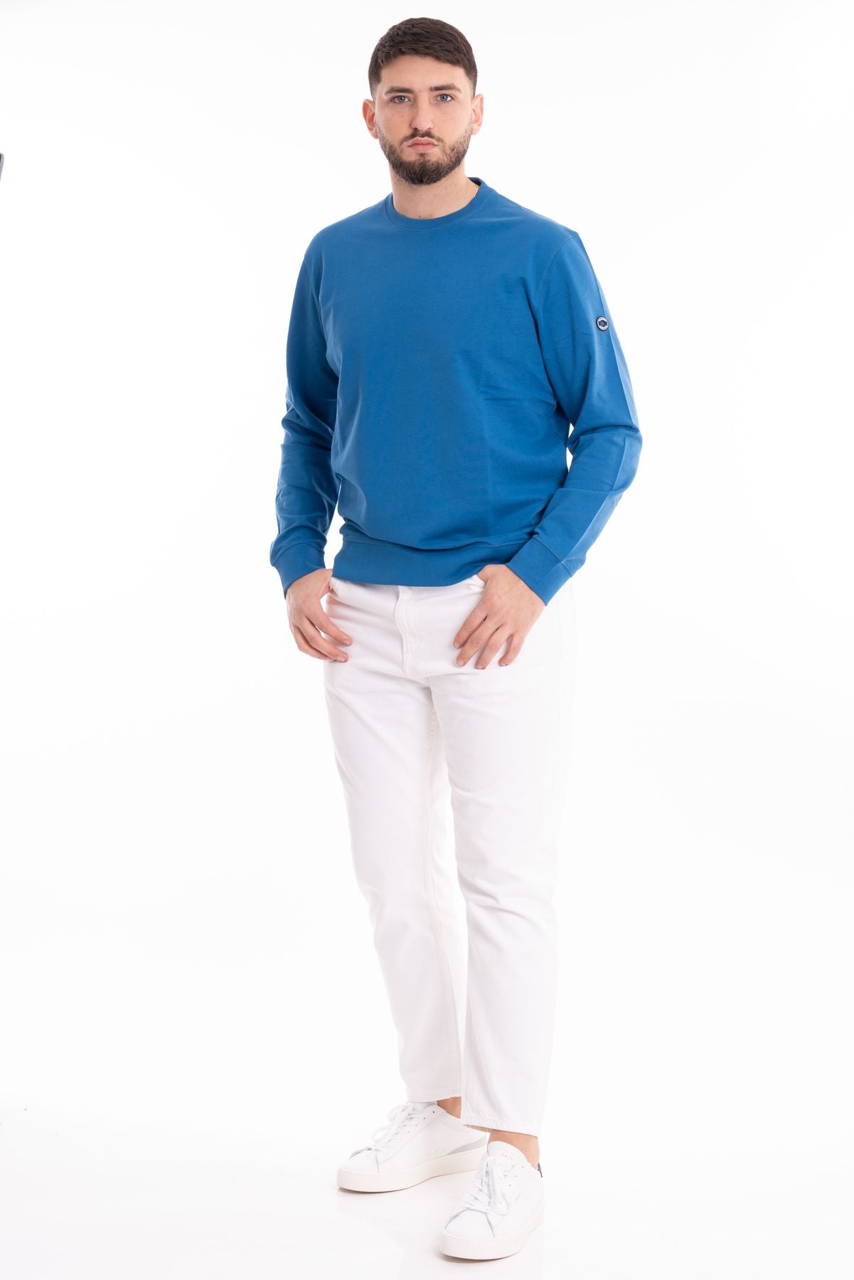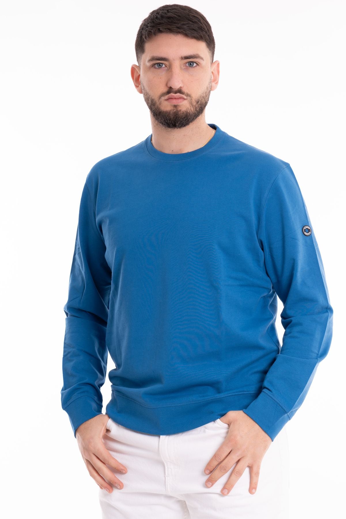 Felpa basica in tessuto cotone garzato. Girocollo con bordo liscio. Maniche lunghe, polsini e fondo elasticizzati. Vestibilità regolare. Compsoizione tessuto 100% cotone.