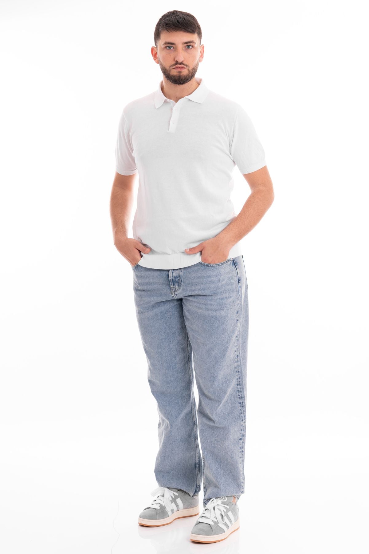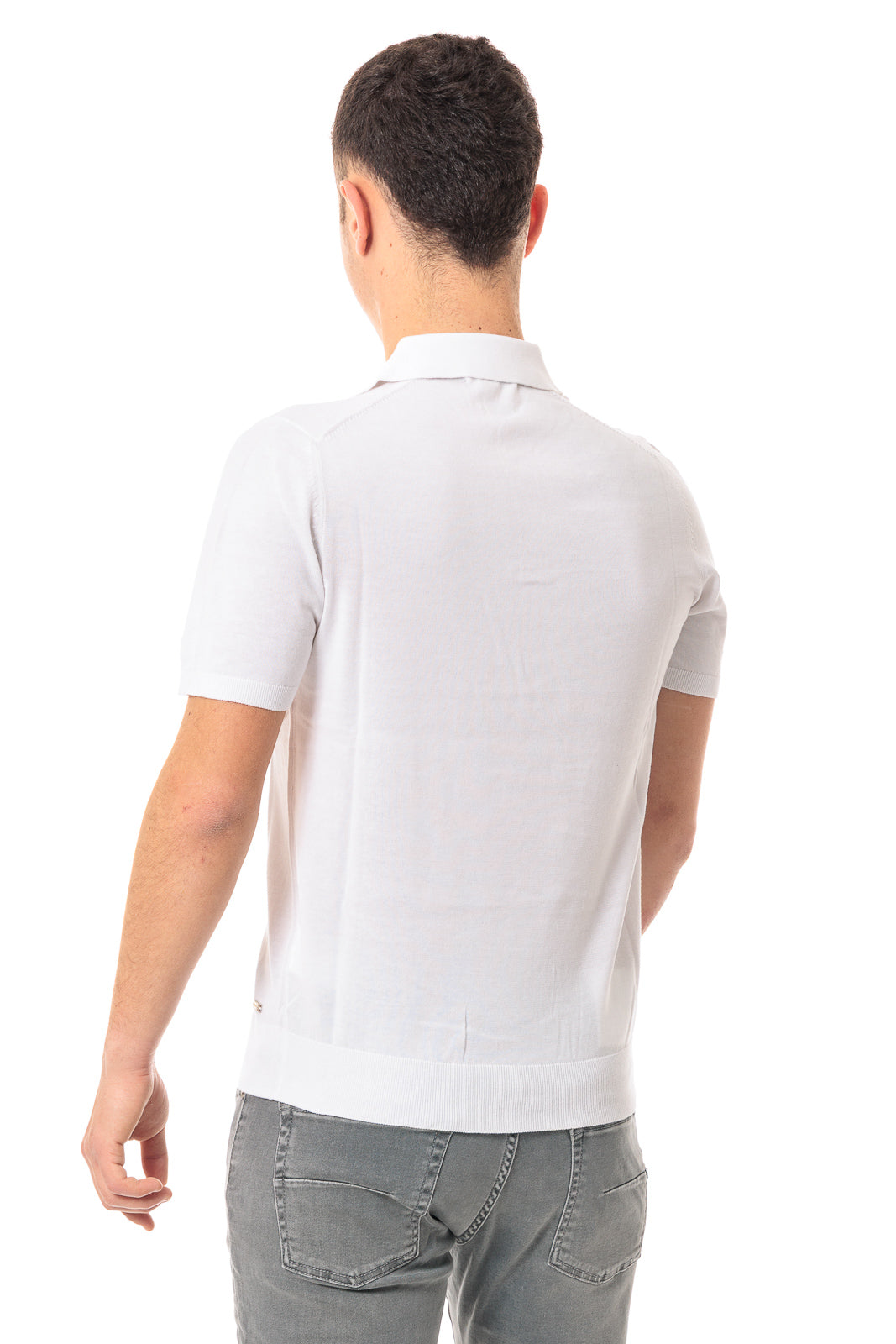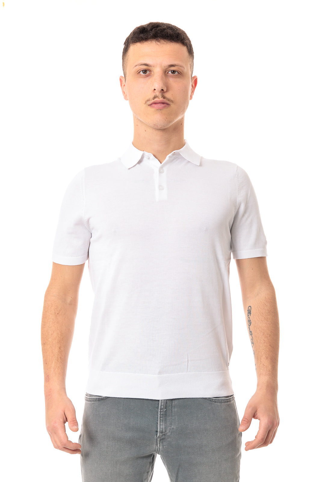 Polo basica in morbido tessuto cotone biologico. Collo piccolo, chiusura con tre bottoni in tinta. Maniche corte con bordo rifinito a canaletti. Vestibilità slim. Fondo con bordo alto rifinito a canaletti. Composizione tessuto 100% cotone.