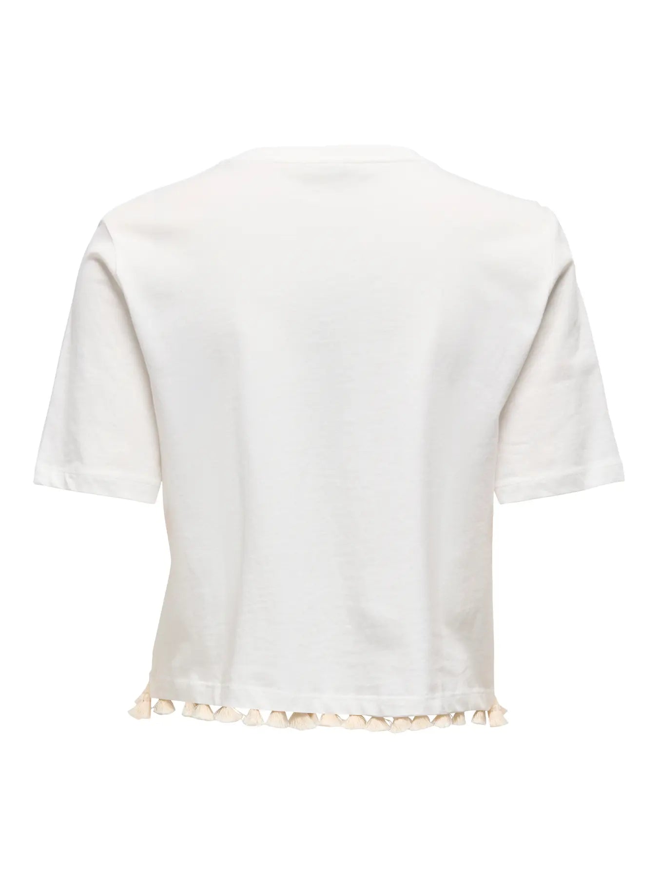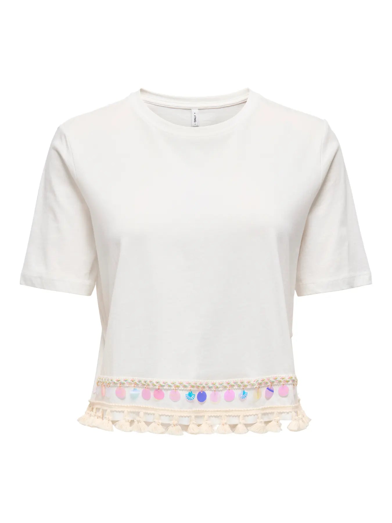 ONLY T-shirt a manica corta bianca da donna. La caratteristica principale è il bordo inferiore, arricchito da dettagli decorativi: piccole monete e nappine nere, insieme a perline e conchiglie, che creano un effetto boho-chic.