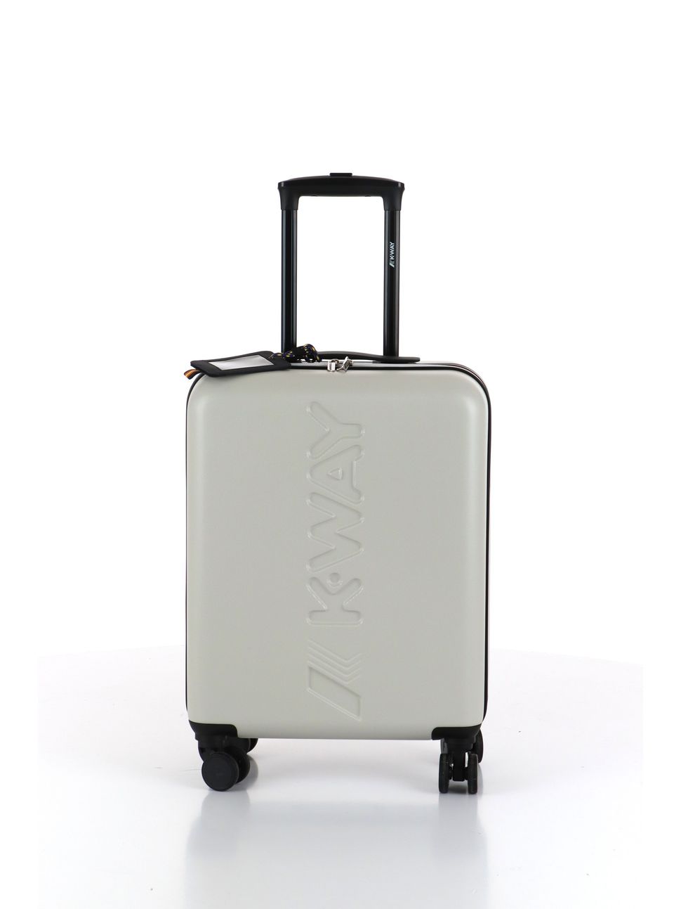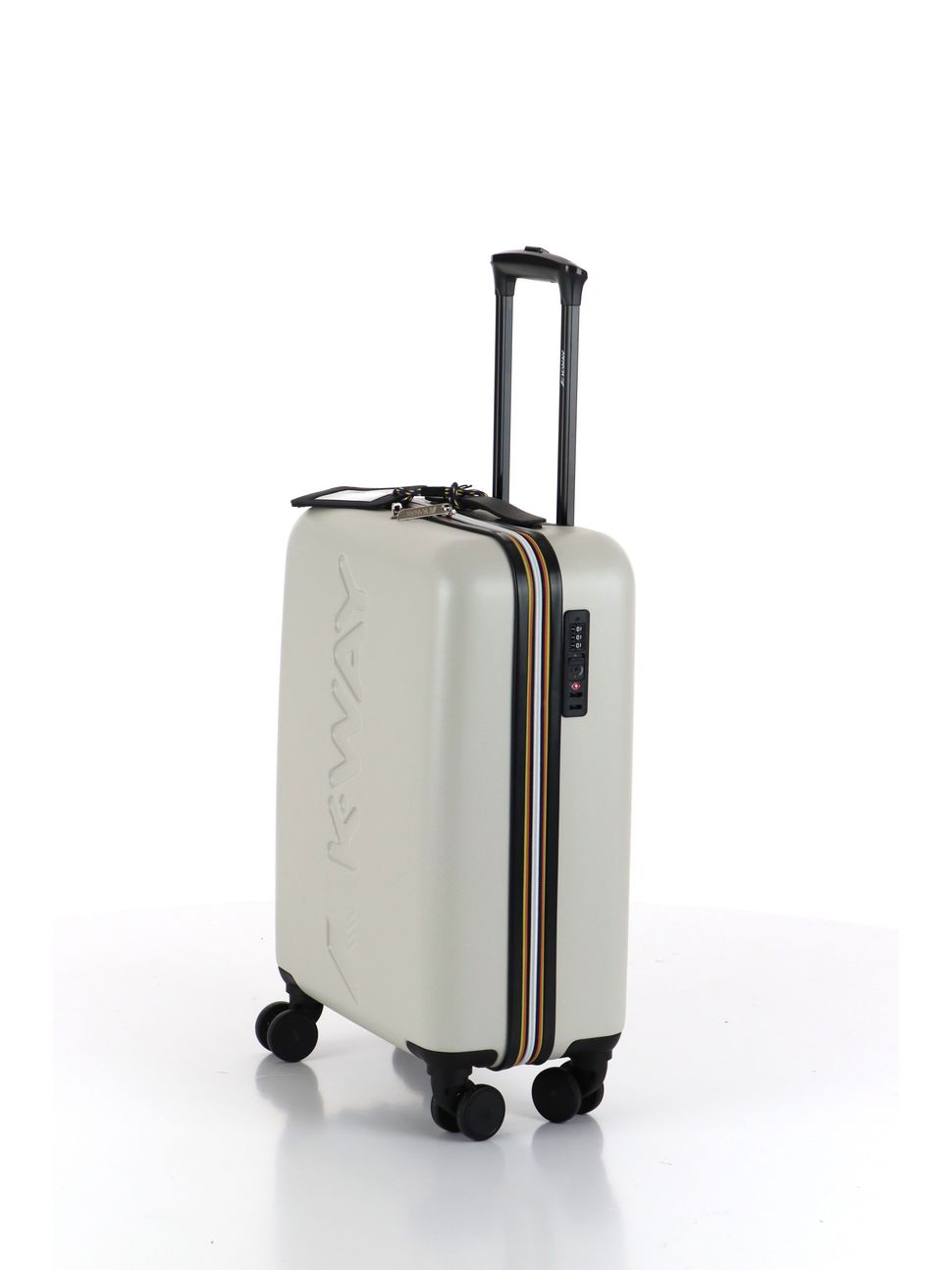 Travel Hard Trolley Medium con grande logo K-Way stampato sul davanti. L'accessorio è dotato di quattro ruote piroettanti a 360° per la massima libertà di movimento, tre tasche interne con cerniera ed elastici incrociati multicolor. Chiusura con combinazione e lucchetto TSA.