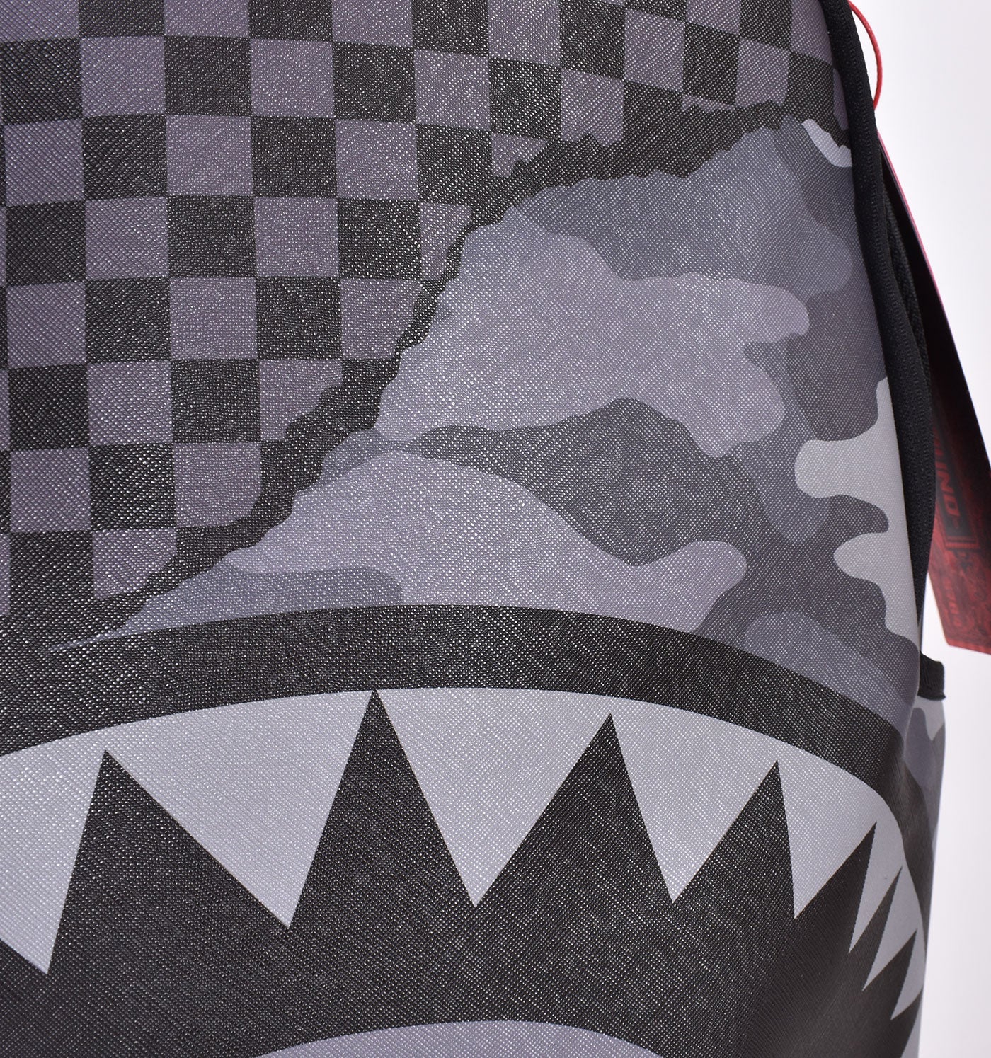 Zaino in pelle vegan, fantasia a scacchi grigio e nero con contrasto camouflage e stampa denti di squalo. Apertura cerniera in metallo a doppio cursore, retro con imborritura e scomparto laptop, spallacci regolabili.