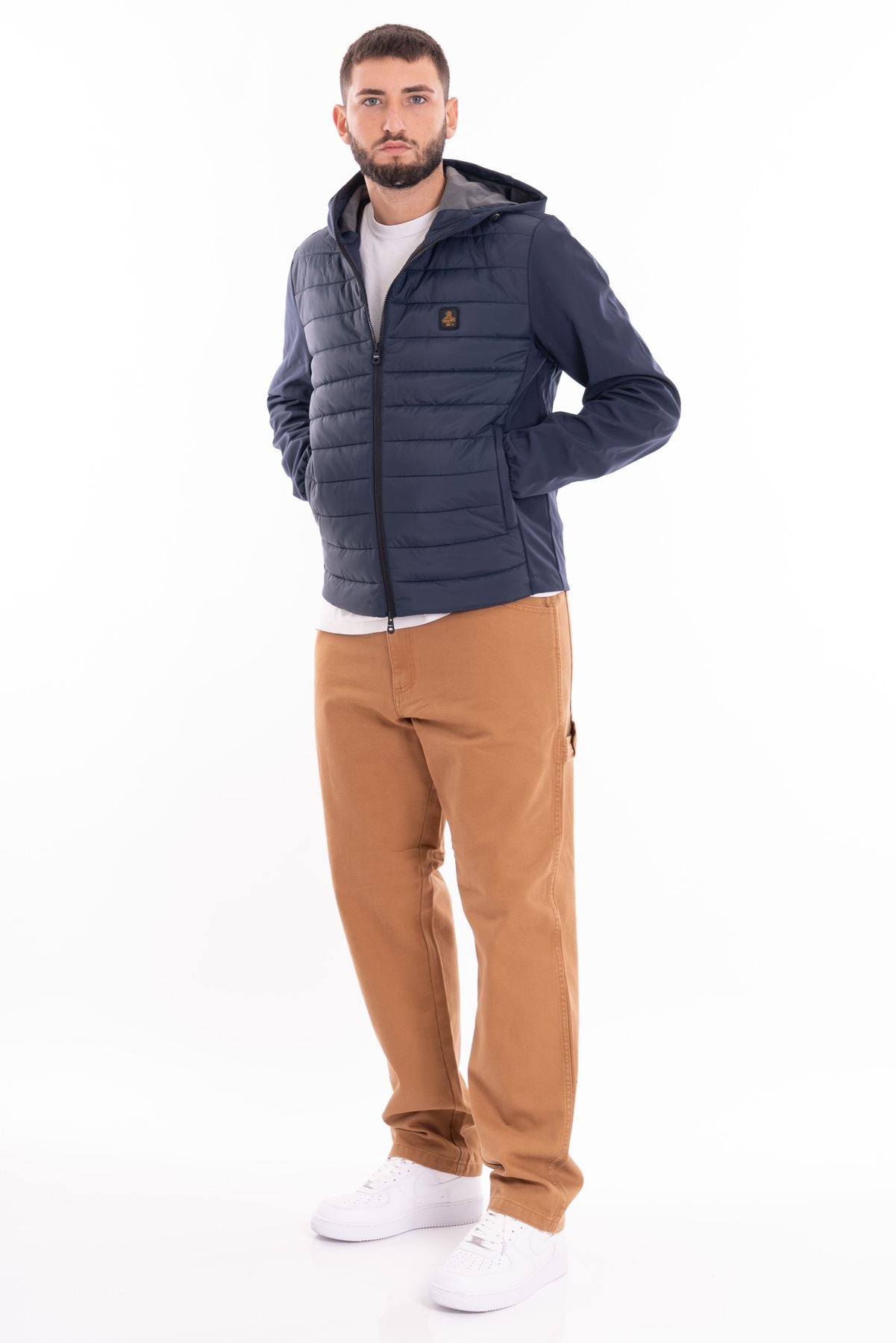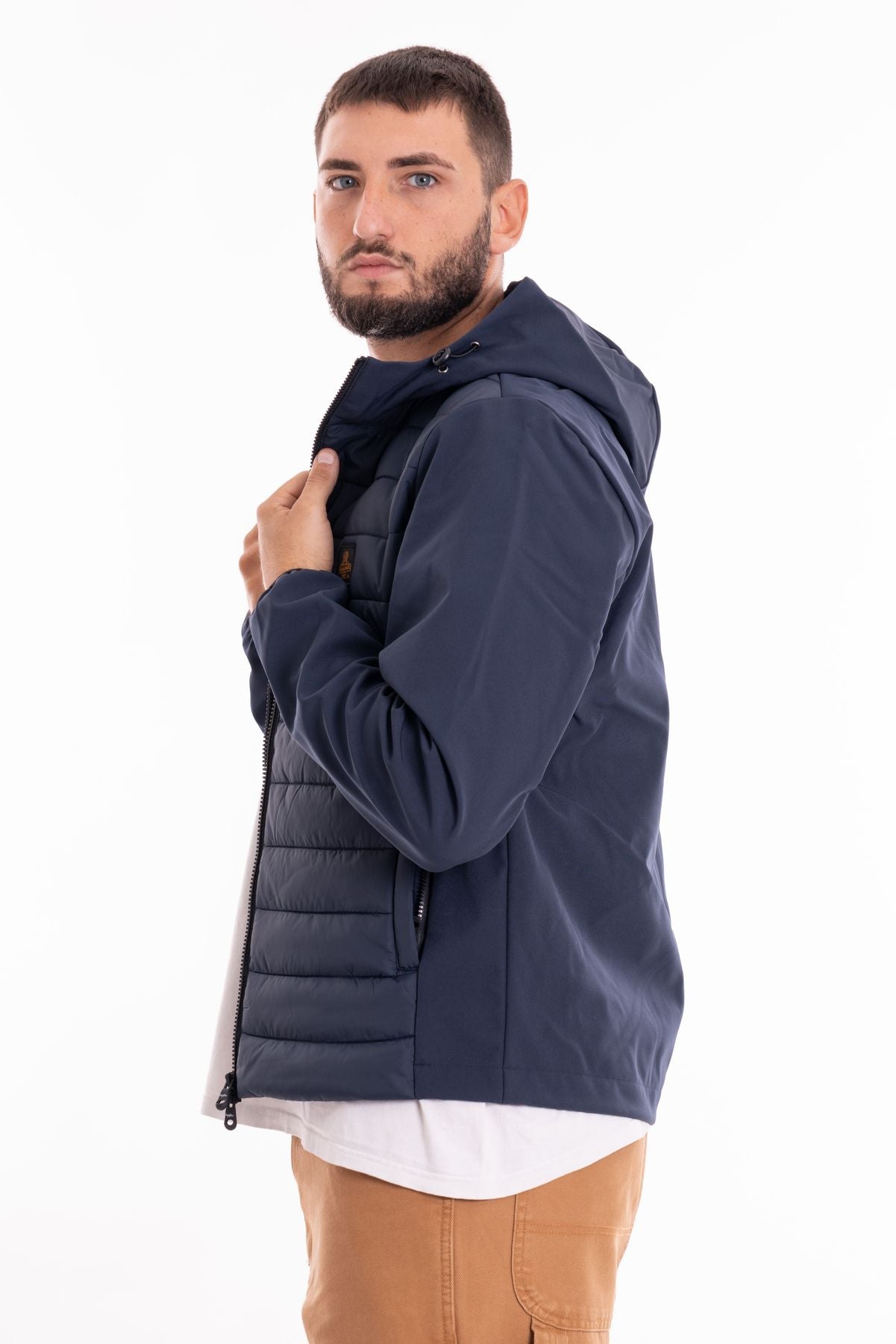 Men's winter down jacket with softshell inserts perfect for facing even the coldest temperatures, padding on the front and sleeves in 90-10 down, hood and back in softshell technical fabric with external water-repellent treatment and internal fleece to keep you warm in the first cold weather season.